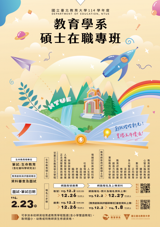 檢送國立臺北教育大學教育學系「教育創新與評鑑碩士在職專班」、「生命教育碩士在職專班」114 學年度招生相關資訊,敬請惠予公告,並轉知鼓勵所屬教師踴躍報考,至紉公誼。 |