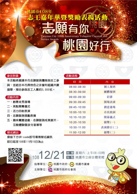 轉知 社會局訂於 108 年 12 月 21 日(星期六)上午 8 時假桃園市立體育館辦理「桃園市 108 年志工嘉年華暨獎勵表揚活動」一案。