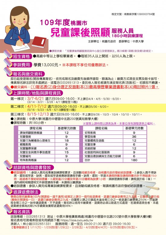 轉知中原大學 辦理之「109 年度桃園市兒童課後照顧服務人員 180 小時專業訓練課程」簡章及報名表 1 份,請查照並請惠予公告轉知貴屬人員報名參加。